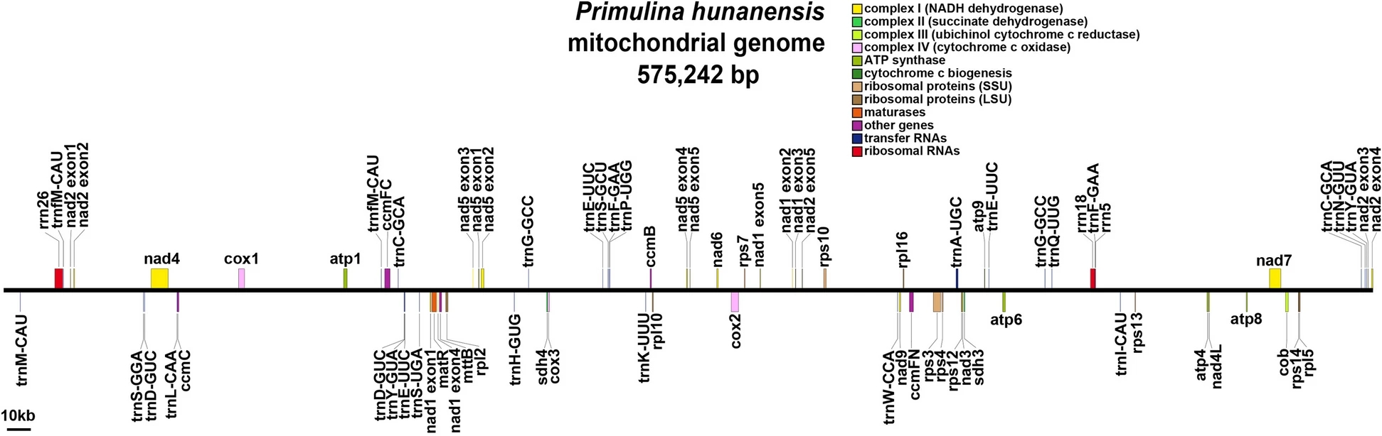 They found that the mtDNA of P. hunanensis was 575,242 bp in total length, with a GC content of 43.54%. Long-read data supported the assembly into a linear structure encoding a total of 60 genes, including 37 protein-coding genes, 20 transfer RNA genes, and three ribosome RNA genes.