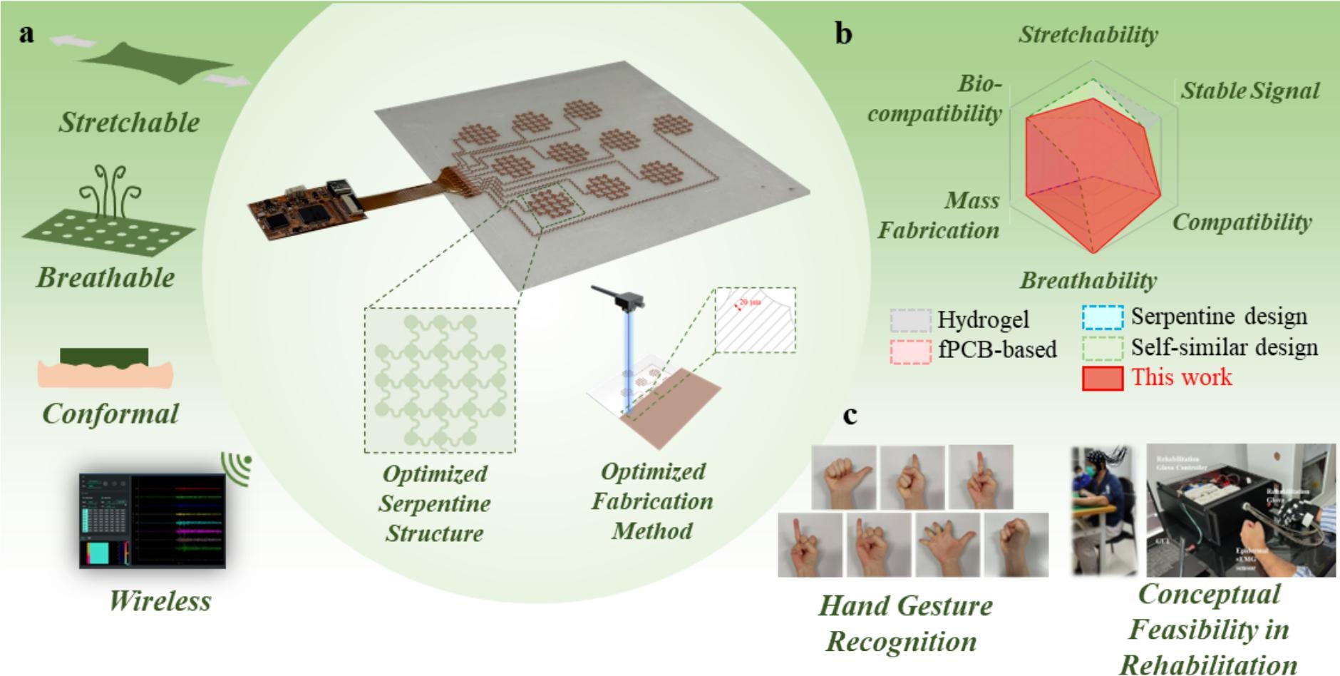The optimized serpentine structures, with improved stretchability and fill ratio, provide lower impedance and high quality sEMG signals. Compared to traditional serpentine design, the signal-to-noise ratio of the new sensor has been increased from 18.89 dB to 29.15 dB, greatly improving the quality of the sEMG acquisition.