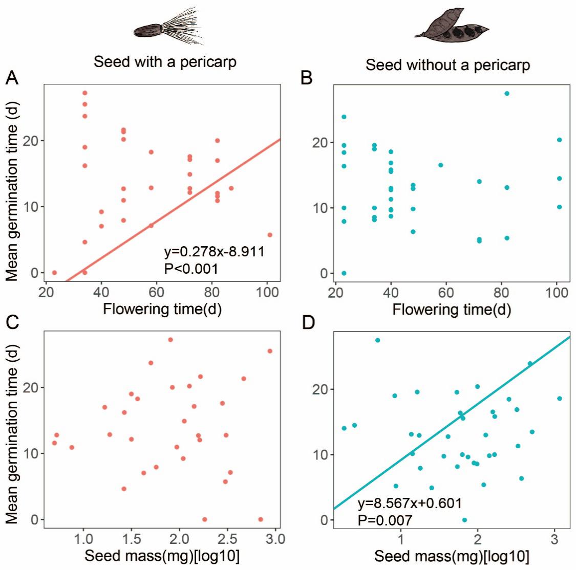 The mean germination time (in days) in relationship to flowering time (in days; a, b) and seed mass (in milligrams; c, d) of seeds with a pericarp (red) and seeds without a pericarp (blue) (Image by WBG)