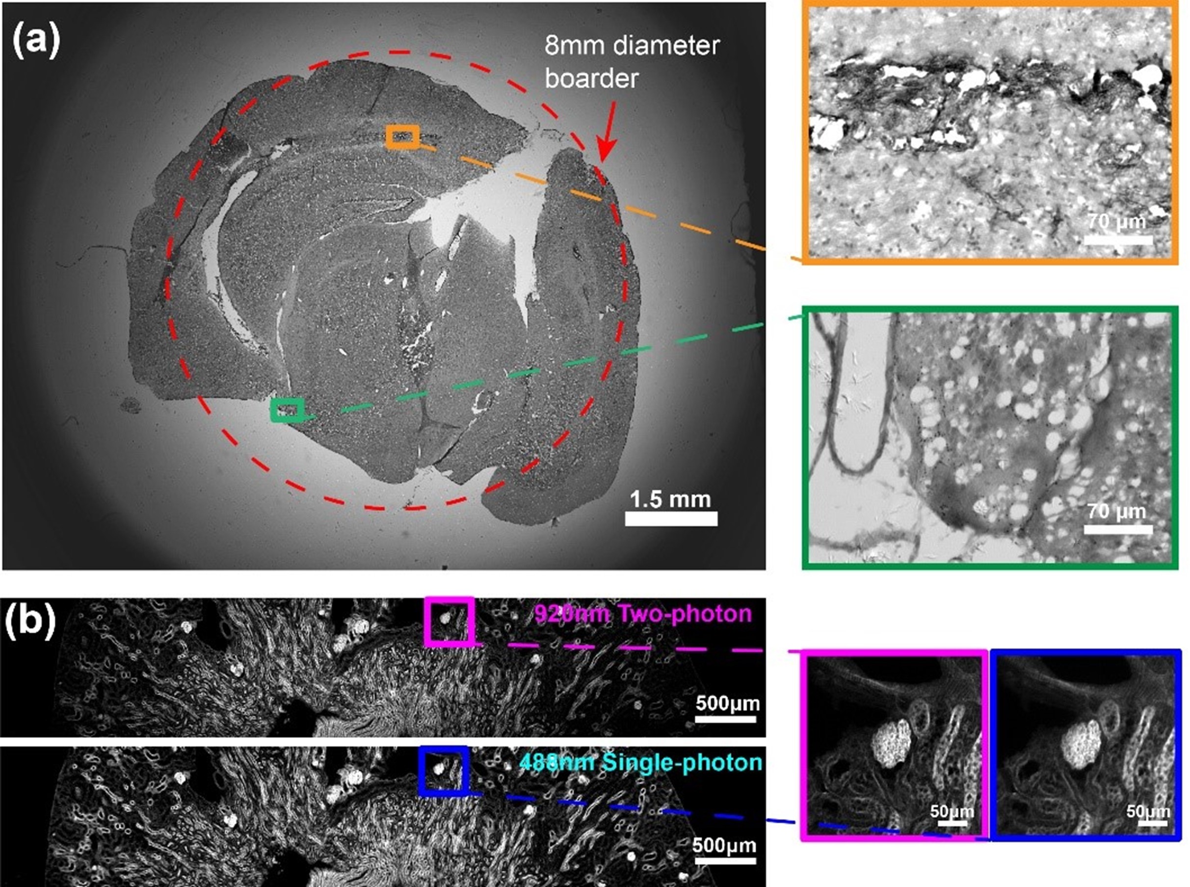 This objective lens features an 8mm FOV diameter, a 0.5NA numerical aperture, and an imaging band extending from 400-1000nm. Utilizing this objective lens for imaging mouse brain and kidney slices, researchers obtained ultra-high-throughput images with a single frame of 1.35 billion pixels (Figure 2a).
