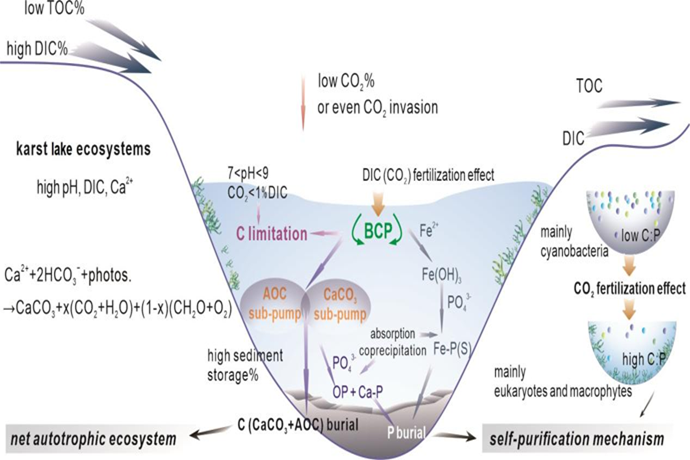High pH and dissolved inorganic carbon in karst lake reservoirs lead to C limitation and CO2 fertilization, promoting efficient recycling of autochthonous organic carbon and enhanced carbonate sedimentation that removes excess phosphate (Fig. 1).