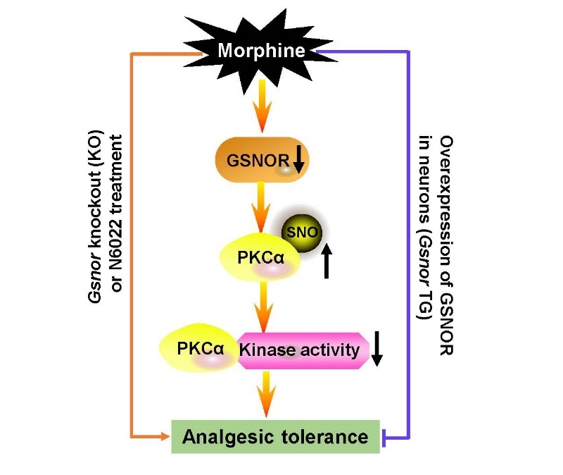 Various experimental evidence suggests that GSNOR plays a significant role in morphine analgesic tolerance, revealing a new mechanism in which protein S-nitrosation modification regulates morphine analgesic tolerance.