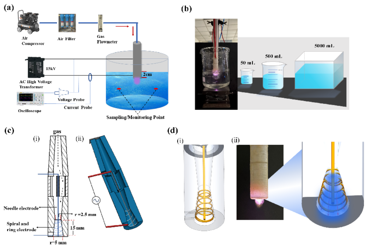 Fig. 1. The overview of GADP setup. (a)The schematic diagram of the experimental setup; (b) The usage scenario of GADP during the experiment and container diagram for three ASW volumes; (c) The structure diagram and cutaway view of the reactor chamber; (d) The 3D structure diagram and discharge principle of the electrodes in the reactor chamber. (Image by SIBET)