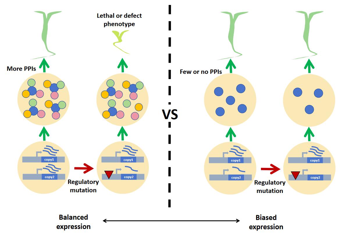 Figure 1. Model depicting how balanced expression of duplicate genes from a whole-genome duplication is associated with dosage-balance contraints (Image by Prof. SHI et al.)
