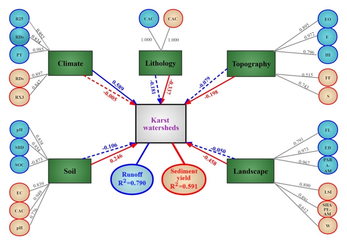 The PLS-SEM analysis of the effects of climate, lithology, soil, topography and landscape on runoff and sediment yield for 40 karst watersheds. (Image by LI Zhenwei)