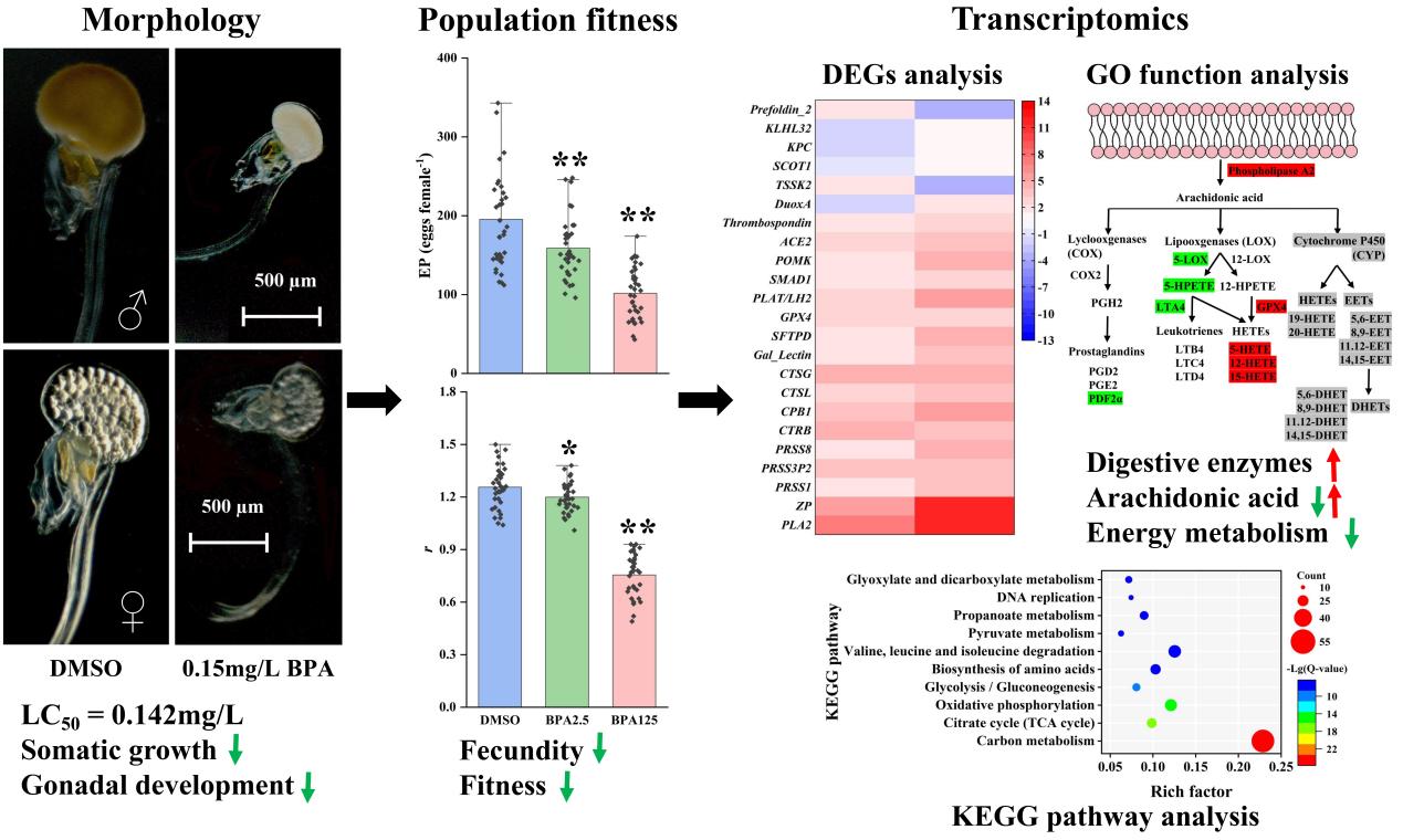 Further morphological and transcriptomic analyses illuminated the specific toxic effects of BPA on Oikopleura dioica. At environmentally relevant concentrations of 125 μg/L, BPA significantly disrupted the growth and reproduction processes of the appendicularian, affecting the normal secretion of digestive enzymes and phospholipase A2, thereby impairing digestive system function and arachidonic acid metabolism.