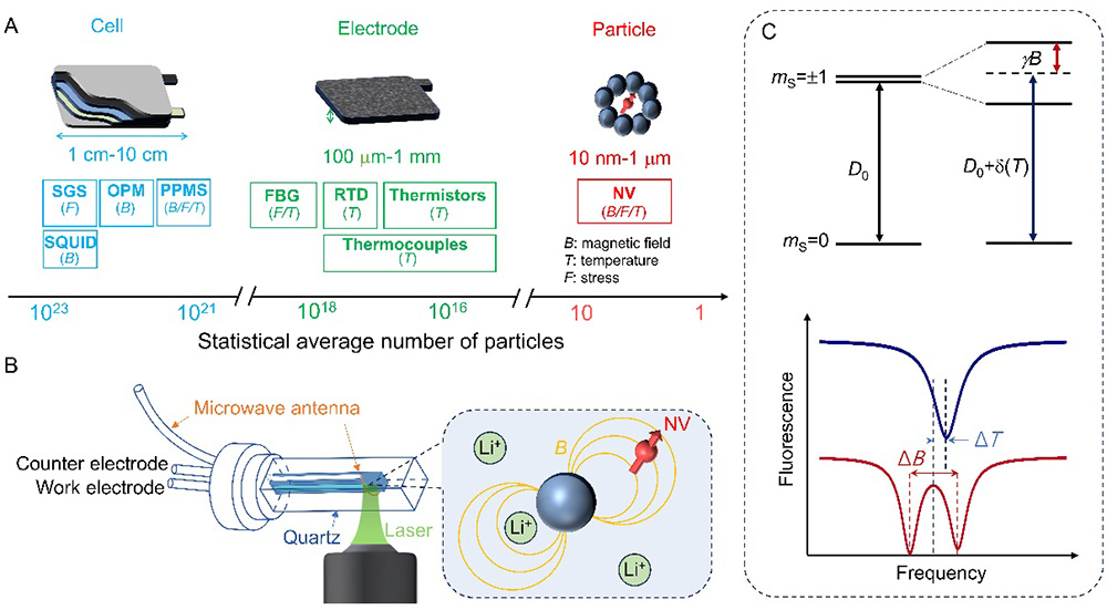 NV sensors offer spatial resolution from 1nm to 1μm and are sensitive to variations in temperature, stress, and magnetic fields, holding great potential for real-time, non-destructive monitoring of battery electrode particles.
