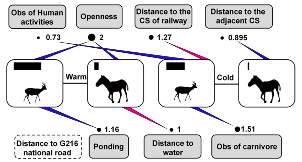 Besides, researchers found that khulan preferred CSs that were open and in proximity to water sources, while goitered gazelles favored CSs that include ponding and feature large openness. Factors including the distance from railway CSs, the presence of predators, and human activity, were also identified to significantly affect the use of CSs by goitered gazelles.