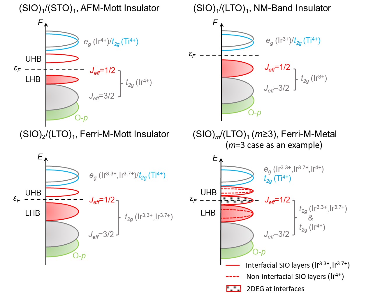 The number of transferred electrons on each Ir atom can be controlled by doping the A-site of LaTiO3 or varying the SrIrO3 layer number m, thereby modulating the oxidation states of Ir. This led to a variety of electronic states, including nonmagnetic band insulators, ferromagnetic metals, ferrimagnetic Mott insulators, and ferrimagnetic metals.