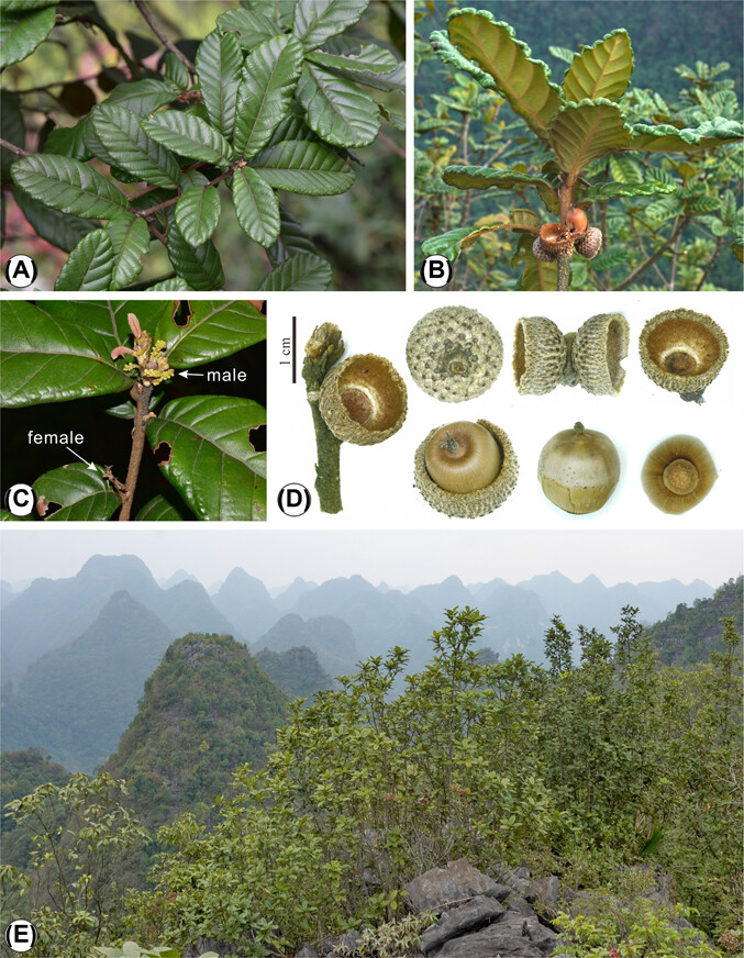 Quercus zhekunii M.Deng & J.Huang, sp. nov. (A, C) Fresh leaves and a current year young twig with the young male catkins and pistillate flowers from herbarium collection of J. Huang et al. K71-56 (HITBC), (B, D) fresh twigs with cupules and acorns on secondary year branches (type specimen:M. Deng & Y, Tu 27503 [HITBC]), (E) open limestone habitat. (Image by HUANG Jian)