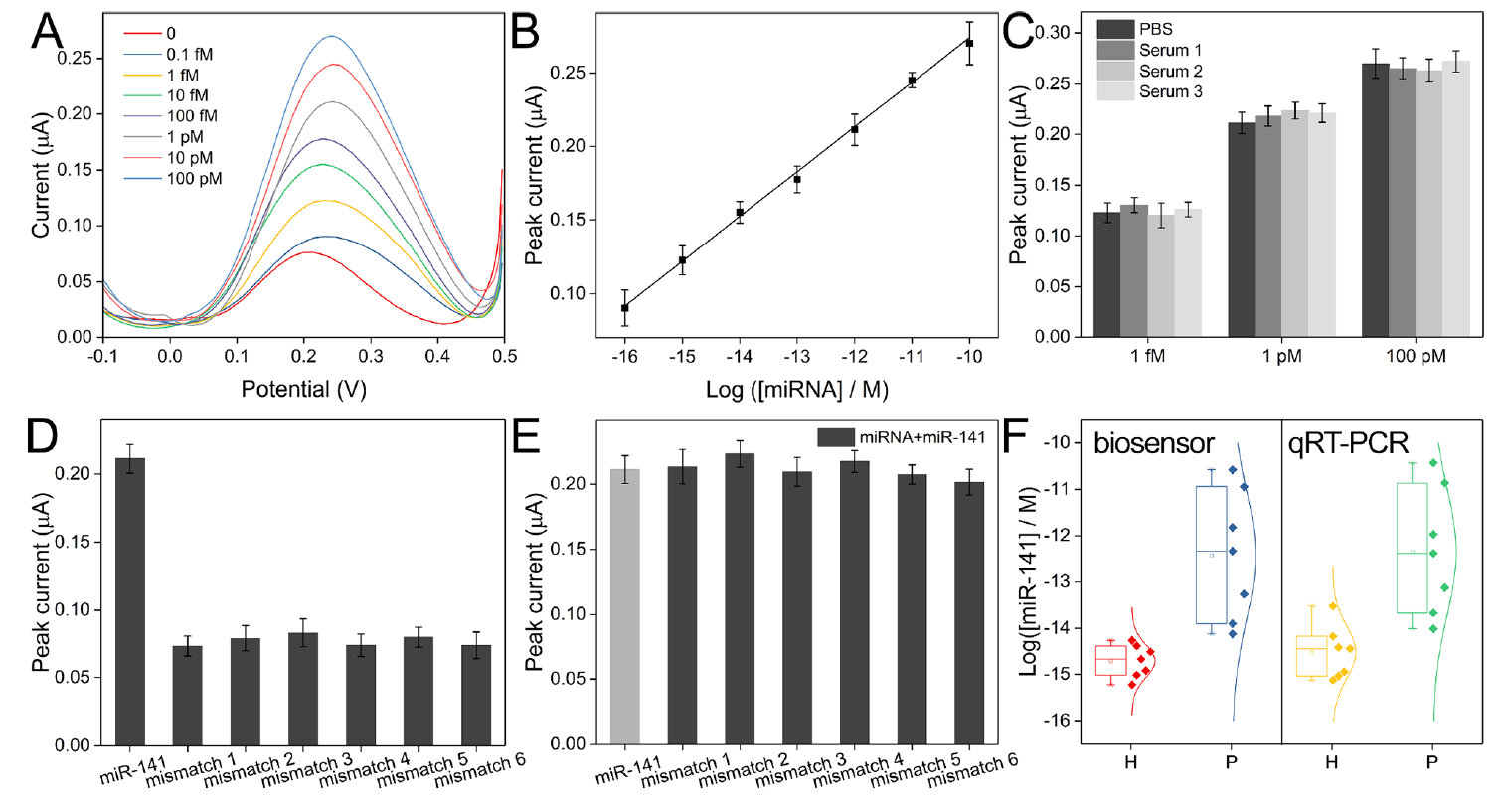Figure 3. (A) Square wave voltammograms for the detection of miRNA with a series of concentrations. (B) Linear relationship between the logarithm of miRNA concentration and the peak current intensity. (C) Recorded peak currents for the analysis of miRNA of different concentrations spiked in standard buffer and serum samples. (D) Comparison of peak currents for the analysis of miR-141 and mismatched sequences. (E) Comparison of peak currents for the analysis of the mixtures of miR-141 and mismatched sequences. (F) Box plot of detected miR141 concentrations in samples from healthy individuals and patients. (Image by SIBET)