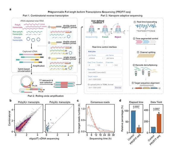PROFIT-seq introduces a programmable transcriptome sequencing strategy that leverages an AI-driven adaptive sequencing algorithm. Unlike conventional methods that rely on complex experimental enrichment, PROFIT-seq requires only the sequence information of the targets, enabling real-time, flexible, and programmable enrichment of different transcript types. It also employs a rolling circle amplification technique to generate full-length cDNA read-through products that facilitate correction of nanopore sequencing errors, resulting in high-fidelity consensus transcript sequences.
