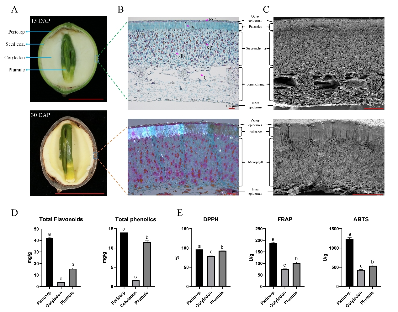 Lotus seed pericarp observations at 15 and 30 days after pollination (DAP). (A) The lotus seed structure. (B) Light microscopic and (C) scanning electron microscopic (SEM) images of lotus seed pericarp. (D) Contents of total flavonoids and total phenolics in the seeds of the lotus cultivar ‘Jianxuan17’. (E) Antioxidant activities in the seeds of the lotus cultivar ‘Jianxuan17’ (Image by WBG)