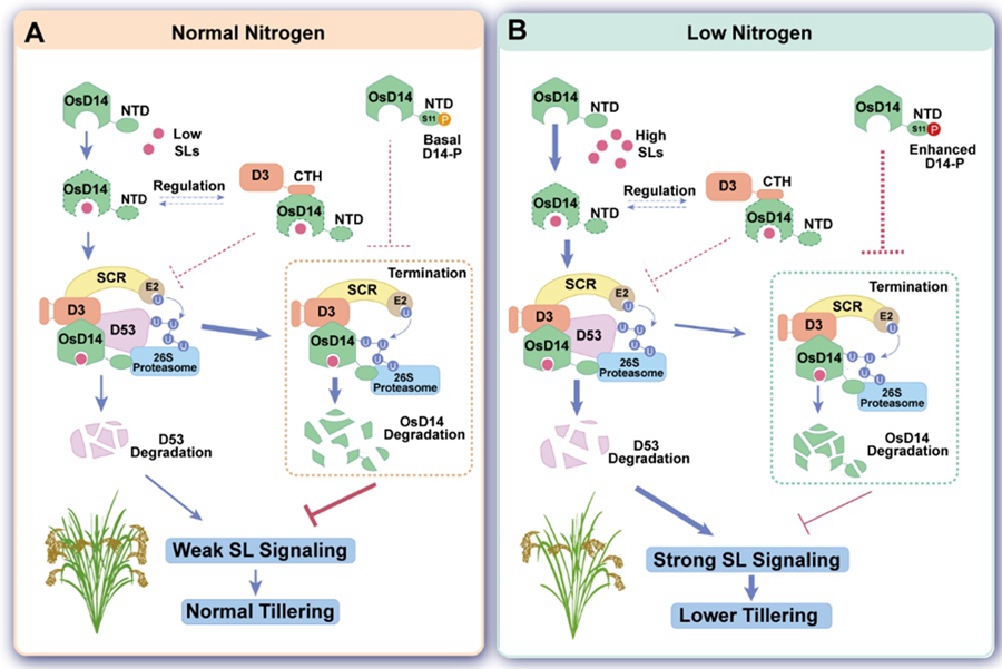 The researchers proposed that the low-nitrogen signal, on the one hand, enhances SL perception by inducing SL biosynthesis and, on the other hand, inhibits D14 degradation by promoting its own phosphorylation, thereby reducing termination of SL perception. These mechanisms synergistically enhance the function of the SL pathway to reduce tiller number.
