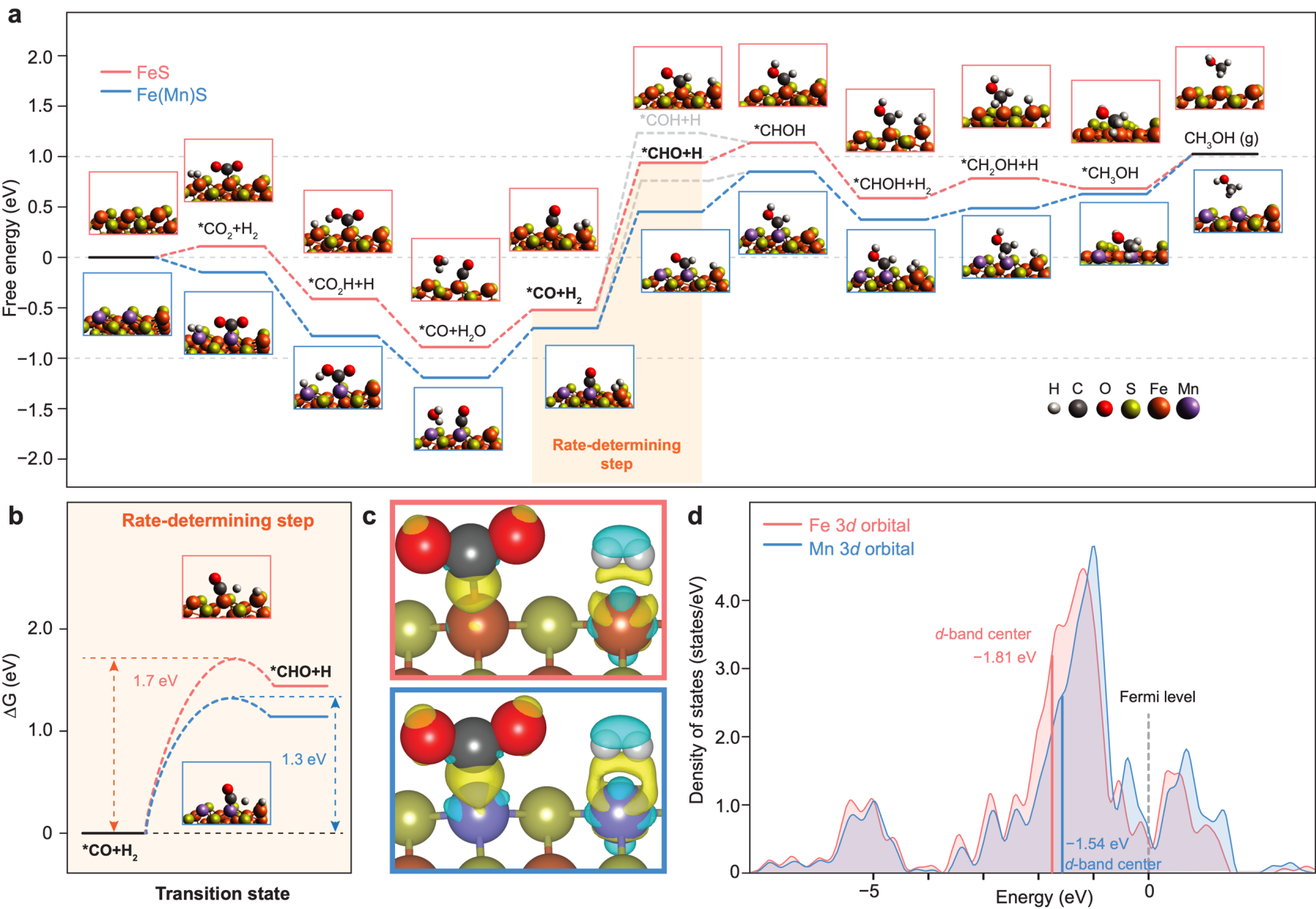 To further investigate the mechanism behind the H₂-driven CO₂ reduction, the team conducted in-situ analyses using diffuse reflectance infrared Fourier transform spectroscopy (DRIFTS). Results indicated that the reaction likely proceeds via the reverse water-gas shift (RWGS) pathway, in which CO₂ is first reduced to carbon monoxide (CO), which is subsequently hydrogenated to form methanol. Density functional theory (DFT) calculations provided additional insights, revealing that manganese doping not only lowered the reaction's activation energy but also introduced highly efficient electron transfer sites, thereby enhancing reaction efficiency (Figure 4). The redox characteristics of iron sulfides make them functionally analogous to modern metabolic enzymes, providing a chemical foundation for prebiotic carbon fixation.