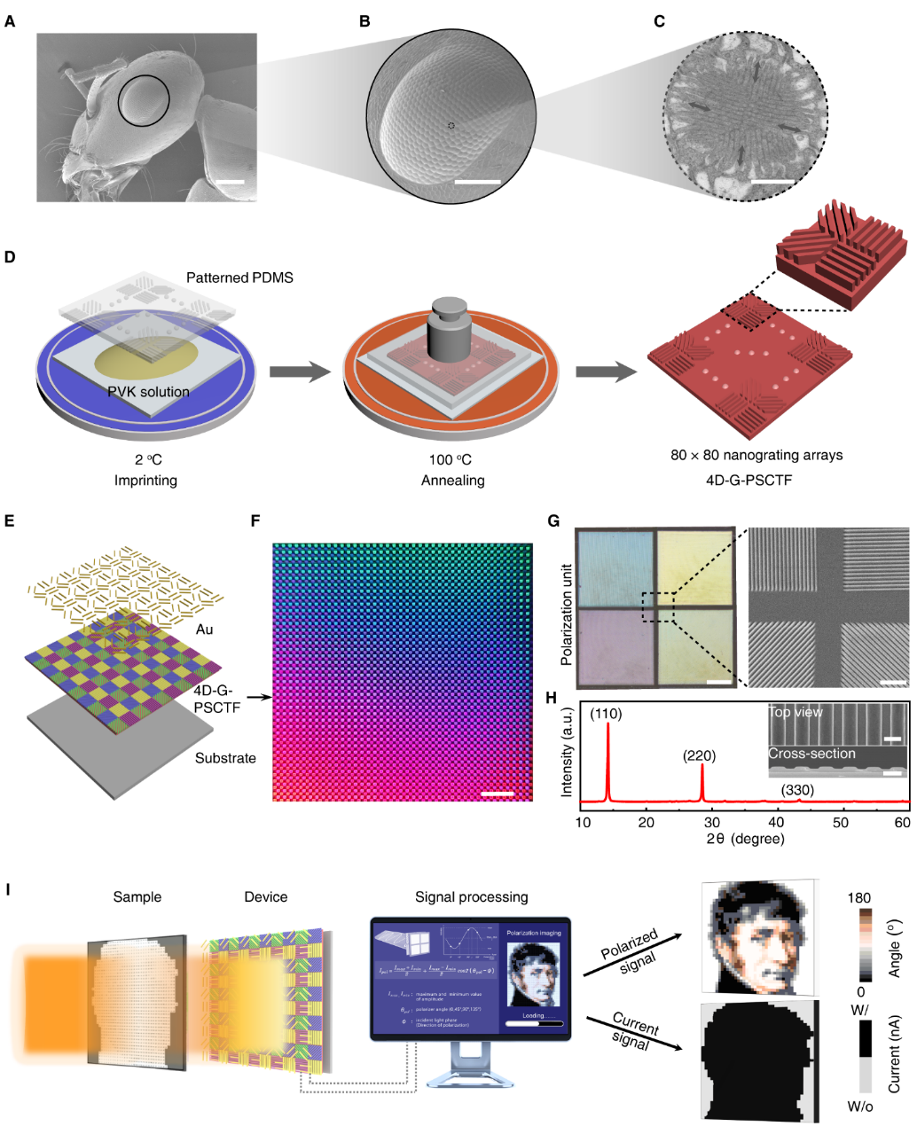 First, Li and her group proposed a one-step nanoimprinting crystallization method. They then used this method to fabricate a high-crystalline perovskite, single-crystal-thin film with high-throughput, quadridirectional grating arrays. Based on this film, the researchers constructed a single-shot, on-chip pol-PD without any additional polarization optics.