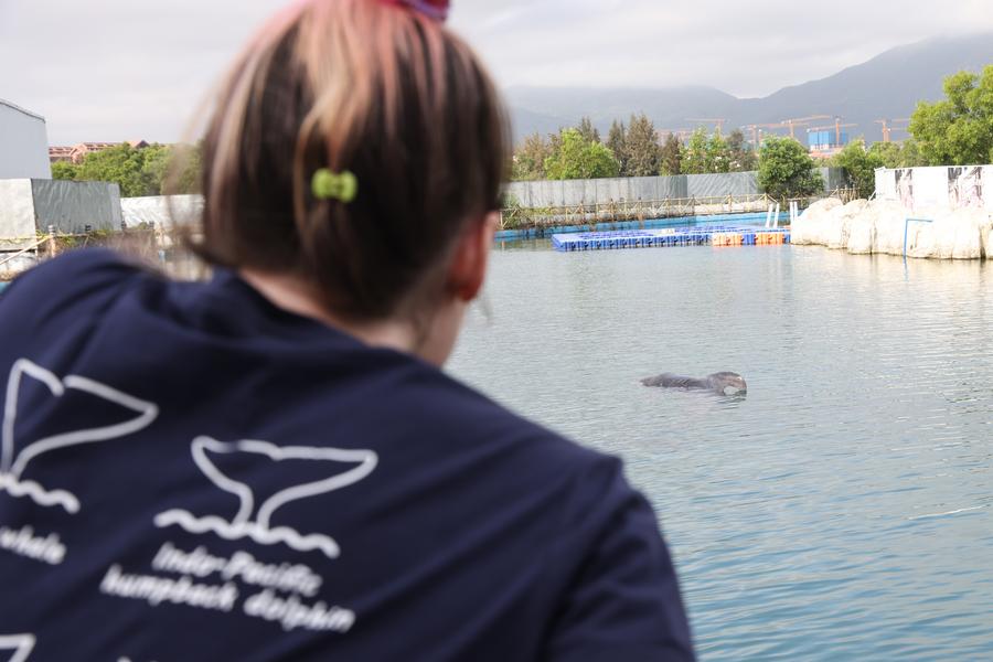 Agathe Serres looks at a rescued short-finned pilot whale at Sanya Haichang Animal Conservation Center in Sanya, south China's Hainan Province, Feb. 28, 2024. (Xinhua/Zhang Liyun)