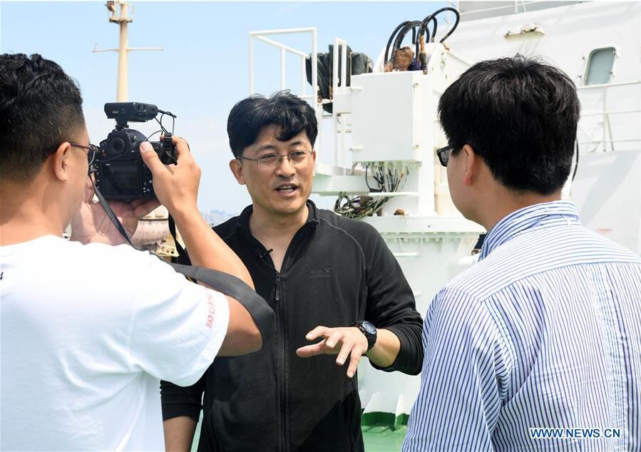 Xu Kuidong (C), chief scientist of the mission with the Institute of Oceanology of the Chinese Academy of Sciences, speaks during an interview on Chinese research vessel Science. Chinese research vessel Science left the eastern city of Qingdao Saturday, on an expedition to the little-known seamounts in the Mariana Trench, the world's deepest natural trench. Researchers will study the topography, hydrology and bioecology of the western Pacific Ocean's typical seamount, said Xu Kuidong, chief scientist of the mission with the Institute of Oceanology of the Chinese Academy of Sciences. (Xinhua/Li Ziheng)