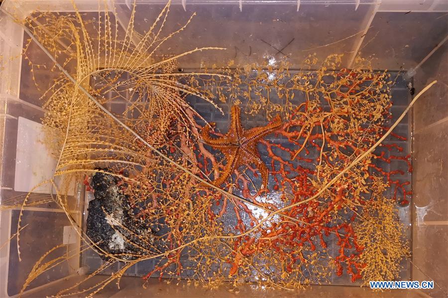 Photo taken on June 15, 2019 shows the corals and a starfish collected by Discovery, a remote operated vehicle aboard KEXUE, in western Pacific Ocean in a recent dive. China's research vessel KEXUE (Science) finished its investigation of seamounts in the west of the Pacific Ocean and started to sail back on Saturday evening. KEXUE is scheduled to arrive in Xiamen of China's Fujian Province on June 23. (Xinhua/Zhang Xudong)