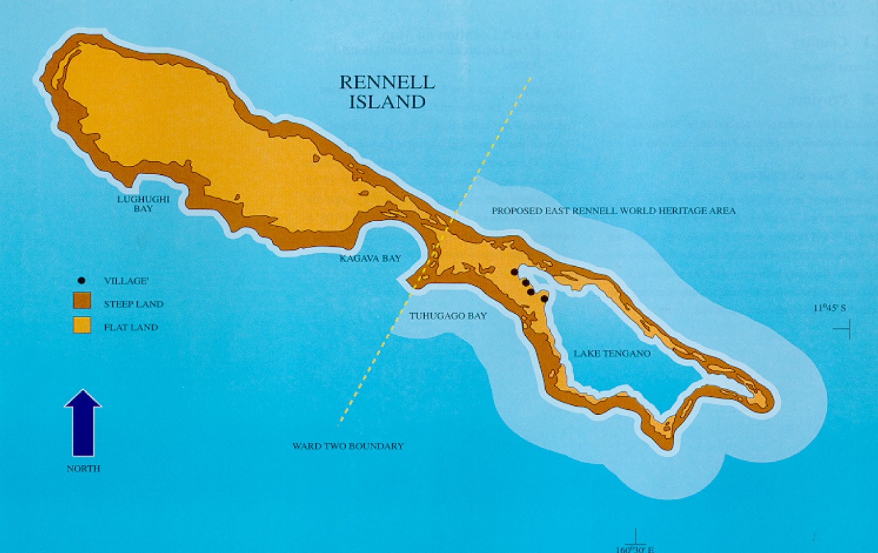 Figure 1. Map of the Rennell Island shows that East Rennell World Heritage site, comprising Lake Tegano, is located in the south of the island; it is the only World Natural Heritage site in the Solomon Islands to date, which was inscribed in 1998 on the World Heritage List as the first-ever natural site that was managed under customary tenure and regulations (Source: UNESCO WHC).