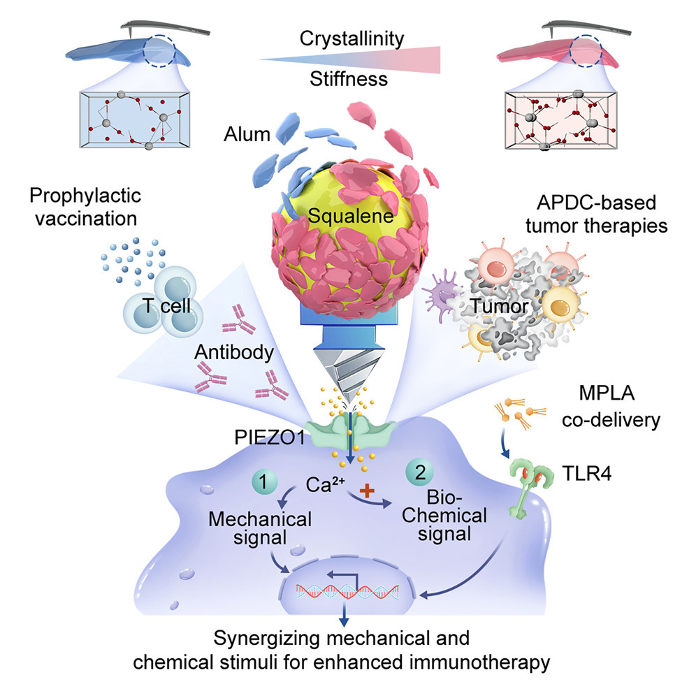 By tuning the crystallinity of aluminum nanoparticles, the interfacial stiffness can be precisely regulated, allowing graded mechanical stimulation. Stronger mechanical cues directly activate the mechanosensitive ion channel PIEZO1, trigger Ca²⁺ influx, and promote antigen cross-presentation.