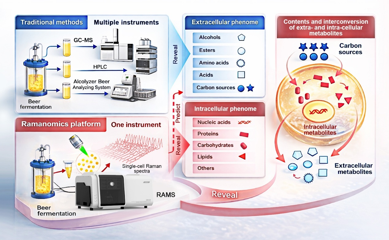 Overview of "process ramanomics". Single-cell Raman fingerprints collected across fermentation provide a fast, label-free window into brewing progress with single-cell resolution. (Image by LIU Yang)