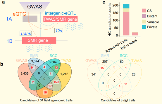 Joint eQTLs of the pan-gene atlas and GWAS, TWAS, and SMR analysis of 34 field agronomic traits and 8 Bgt isolate infection phenotypes in wheat. (Image by IGDB)