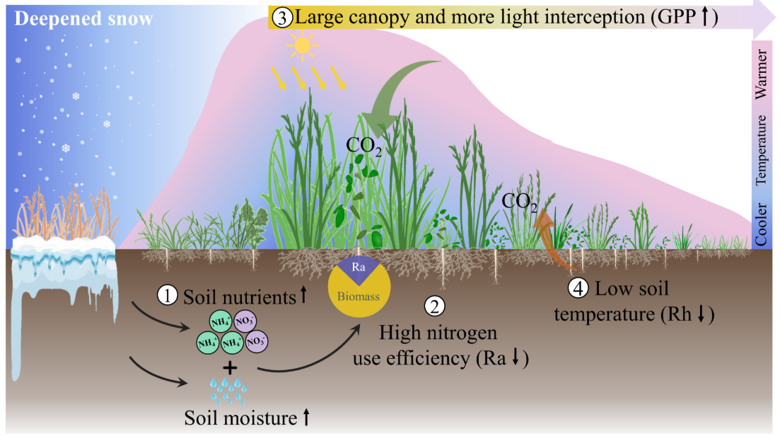 To uncover these mechanisms, the researchers conducted a five-year experiment manipulating snow in Inner Mongolia. They also combined multi-year, high-frequency observations of ecosystem carbon flux, species surveys, and canopy structure analysis during the growing season in temperate grasslands. The researchers found that deepened snow increased soil nitrogen and water availability, which enhanced nutrient uptake and plant nitrogen use efficiency (NUE) synergistically.
