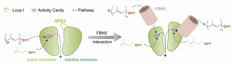 Solanesyl diphosphate synthase (SPS) is a key enzyme in the biosynthetic pathway of plastoquinone, a photosynthetic electron carrier. It has recently been identified as a novel target of herbicides. Fibrillin 5 (FBN5) is believed to play a role in plastoquinone biosynthesis by modulating the catalytic activity of SPS. However, the molecular basis of the interaction between FBN5 and SPS, as well as how FBN5 modulates SPS catalysis, remains unclear.
