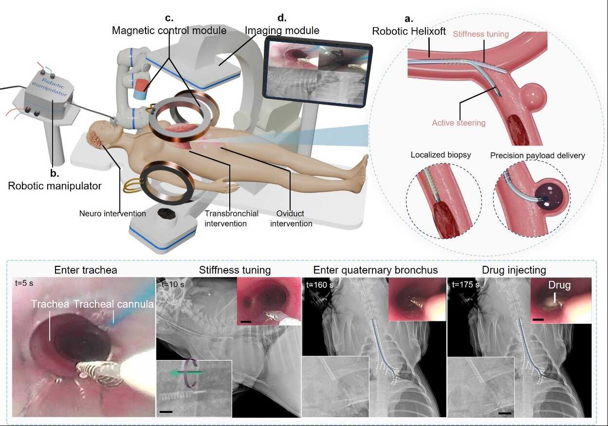 The Helixoft system is specifically designed for the navigation within narrow and sensitive luminal environments by miniaturising the variable-stiffness catheter to a diameter of 300 μm. This microrobotic system has tunable mechanical performance at the microscale by harnessing the microscale helical motion at the component level to dynamically modulate the otherwise static mechanical properties of the overall structure under a magnetic field.