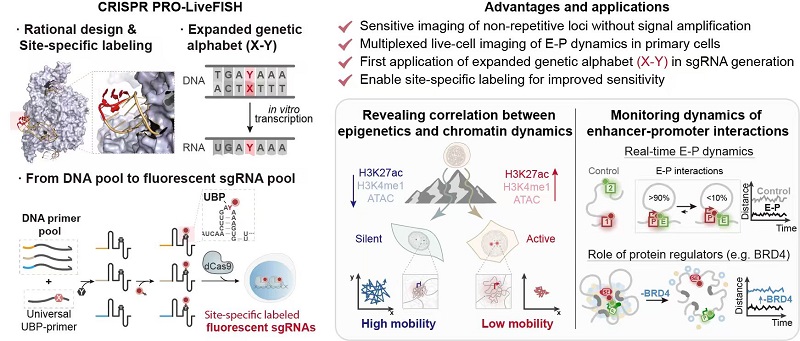 Using PRO-LiveFISH, the researchers achieved simultaneous real-time tracking of multiple genomic loci within living cells. They systematically uncovered the relationship between chromatin dynamics and epigenetic states, elucidated the spatiotemporal characteristics of enhancer-promoter (E-P) interactions, and revealed the critical role of the transcriptional coactivator BRD4 in maintaining super-enhancer three-dimensional (3D) interactions. These findings deepen our understanding of epigenetic regulation and the spatiotemporal dynamics of the 3D genome.