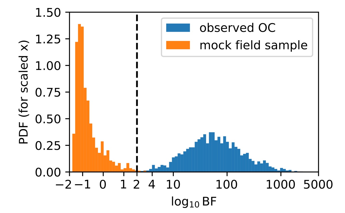The distribution of Bayes factors effectively separates real signals from noise. The blue histogram represents confirmed Open Clusters, while the orange represents mock random field samples. The vertical dashed line marks the threshold at log_{10}(BF) = 2. This clear separation demonstrates that the metric robustly distinguishes genuine physical systems from random background fluctuation. (Image by SHAO)