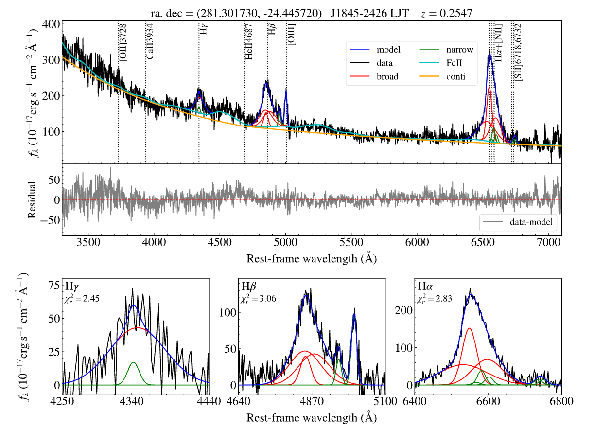 Spectral fitting results for VVV J1845-2426 (Lijiang 2.4m optical telescope). In the top panel, the spectrum (black line) is decomposed into a power-law continuum (orange line), Fe II emission (cyan line), and emission lines (blue line). The emission lines include broad (red line) and narrow (green line) components. The middle panel shows the residuals between the spectrum and the fitted model. The bottom panel presents the fitting results for the Hα, Hβ and Hγ emission lines, respectively. (Image by SHAO)