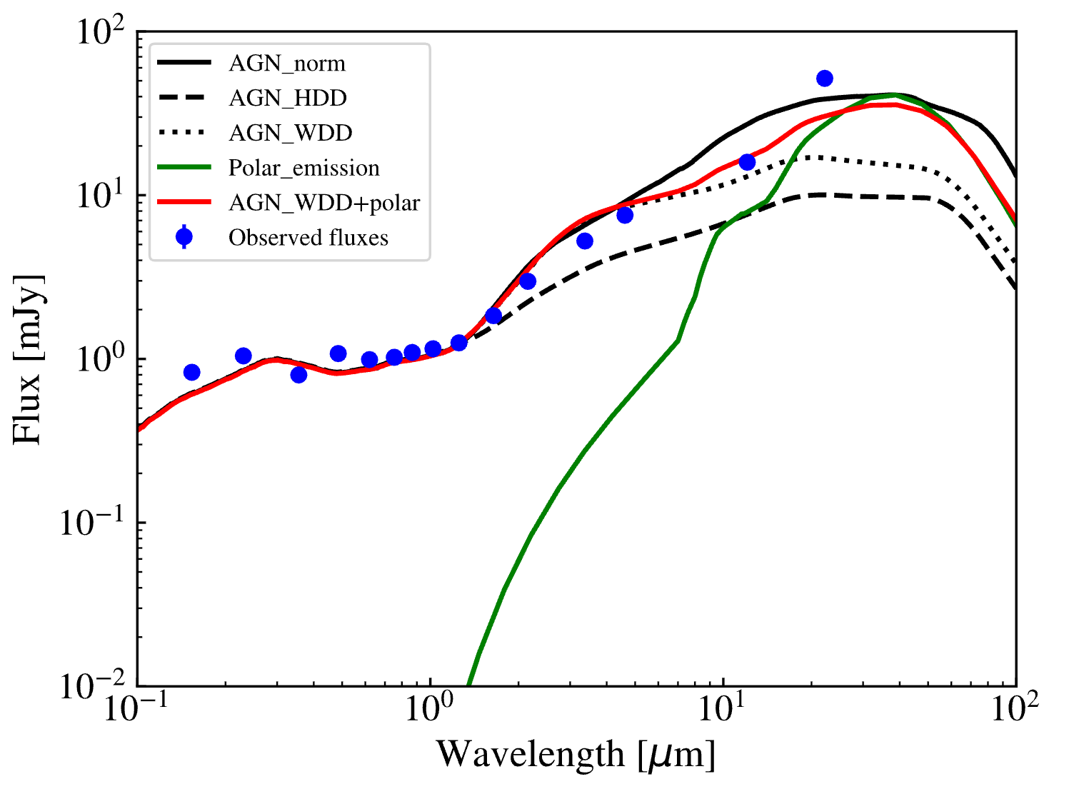 SED fitting results for VVV J1845-2426. The fitting was performed using AGN templates. The best-fit model (red line) is a combination of the warm-dust-deficient AGN template and the polar dust component. (Image by SHAO)