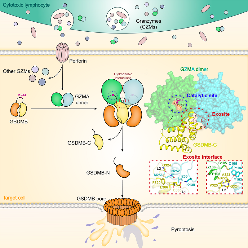 Schematic diagram of exosite-mediated targeting of GSDMB by dimeric granzyme A in lymphocyte pyroptotic killing (Image by DING Jingjin's group)