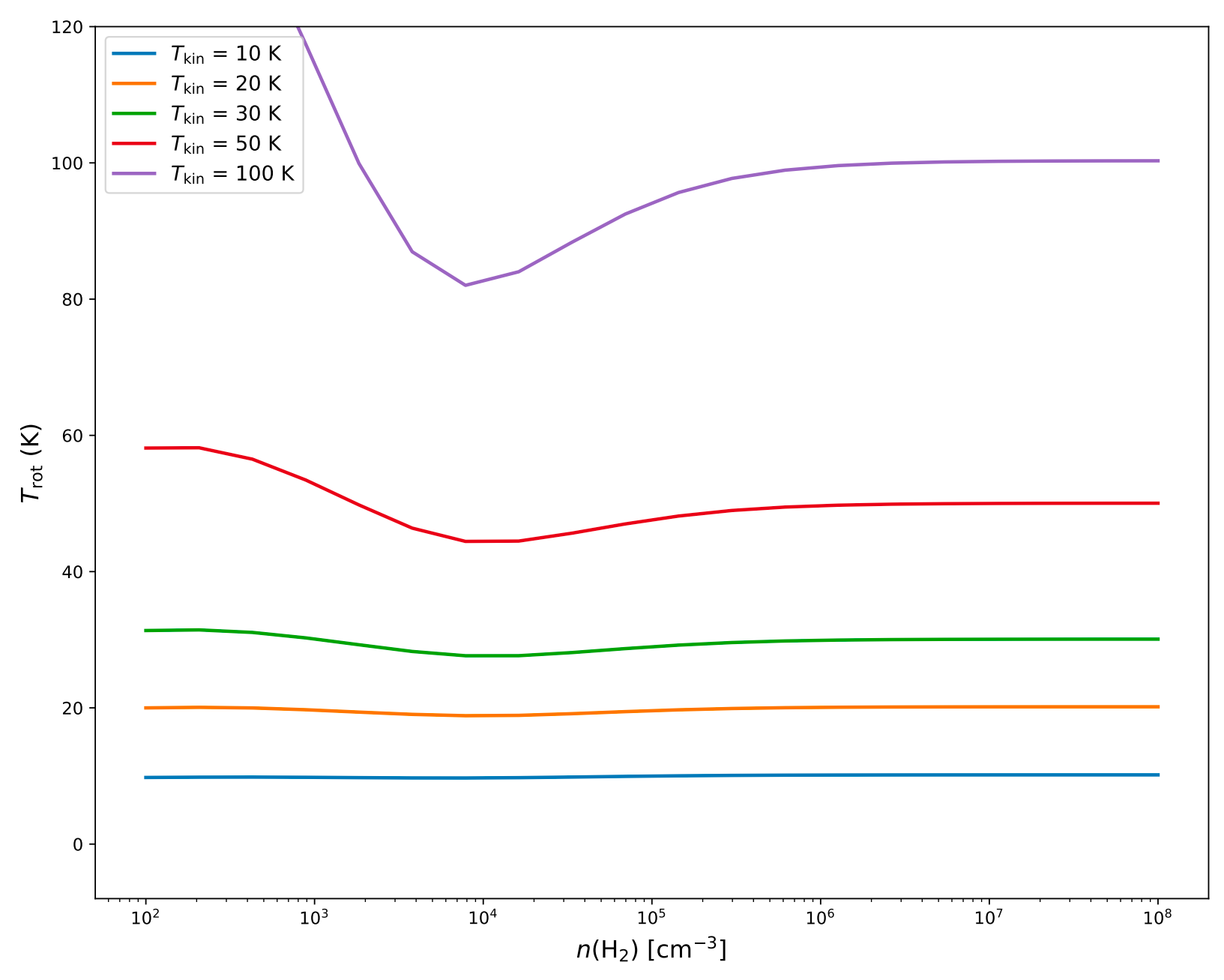 Statistical equilibrium calculation results for CH₃CCH. At densities above 10⁴ cm⁻³, the rotation temperature derived from CH₃CCH is essentially consistent with the gas temperature. (Image by SHAO)