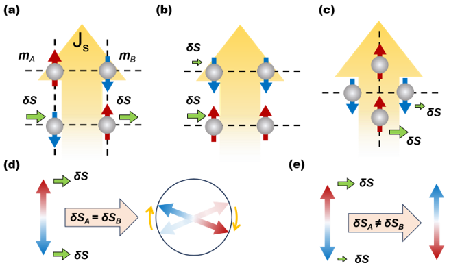 Schematic illustrations of the physical mechanism underlying asymmetric spin torque in antiferromagnetic systems. At the interface of thin films or devices, symmetry reduction results in unequal absorption of the injected spin current by the A and B sublattices of the antiferromagnet, thereby generating an asymmetric spin torque that drives deterministic switching of the Néel vector. (Image by SHAO Dingfu)