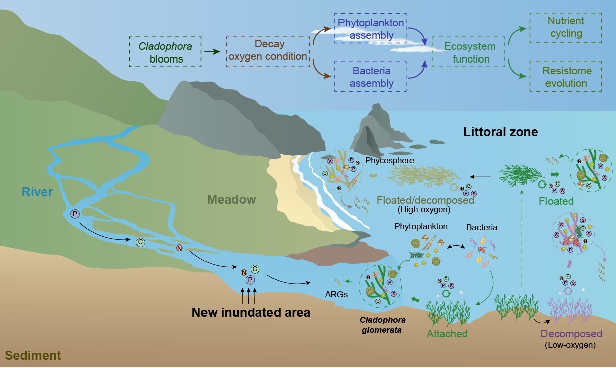 Effects of Cladophora blooms on nutrient cycling and antibiotic resistome evolution in the littoral zone of Qinghai Lake. (Image by IHB)