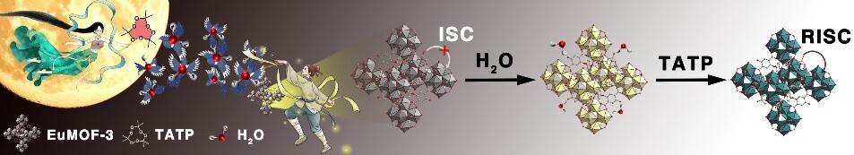 Based on the intersystem crossing mechanism, researchers designed and synthesized three nonfluorescent Eu-MOFs. They found that when the ligand was 2,5-dihydroxyterephthalic acid, the introduction of a small amount of H2O could trigger the cascade reaction of Eu-MOF-3 toward TATP.