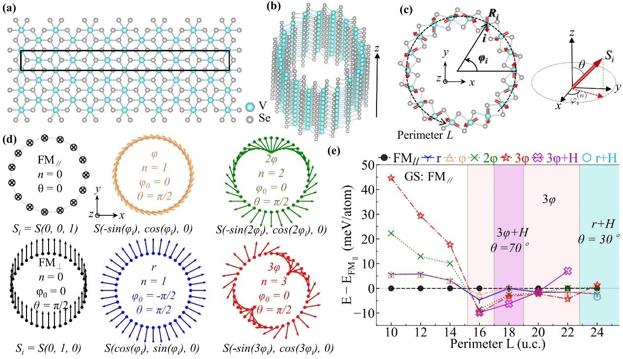 Schematic illustration of high-order magnetic vortex states in magnetic nanotubes and the evolution of the magnetic ground state of VSe2 nanotubes with diameter. (Image by LI Jiawen et al.)