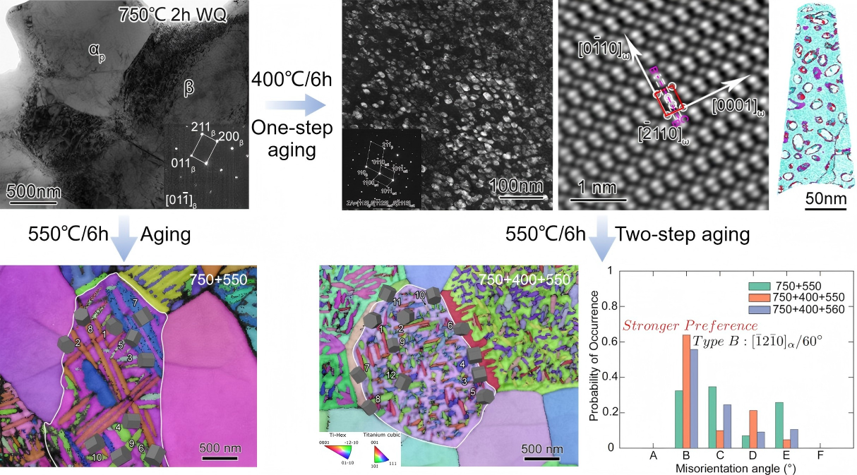 Building on this foundation, a research team led by Profs. MA Yingjie and YANG Rui has now developed a more advanced microstructural optimization strategy. They used controlled metastable ω/α″ phases to induce α nucleation and construct heterogeneous structures. By precisely controlling β phase stability through quenching from α + β phase region, multiply metastable phases can be precipitated. Subsequent multi-step aging treatments activate metastable phase-induced α nucleation, enabling the construction of multi-scale heterogeneous microstructure and overcoming the strength-ductility trade-off.