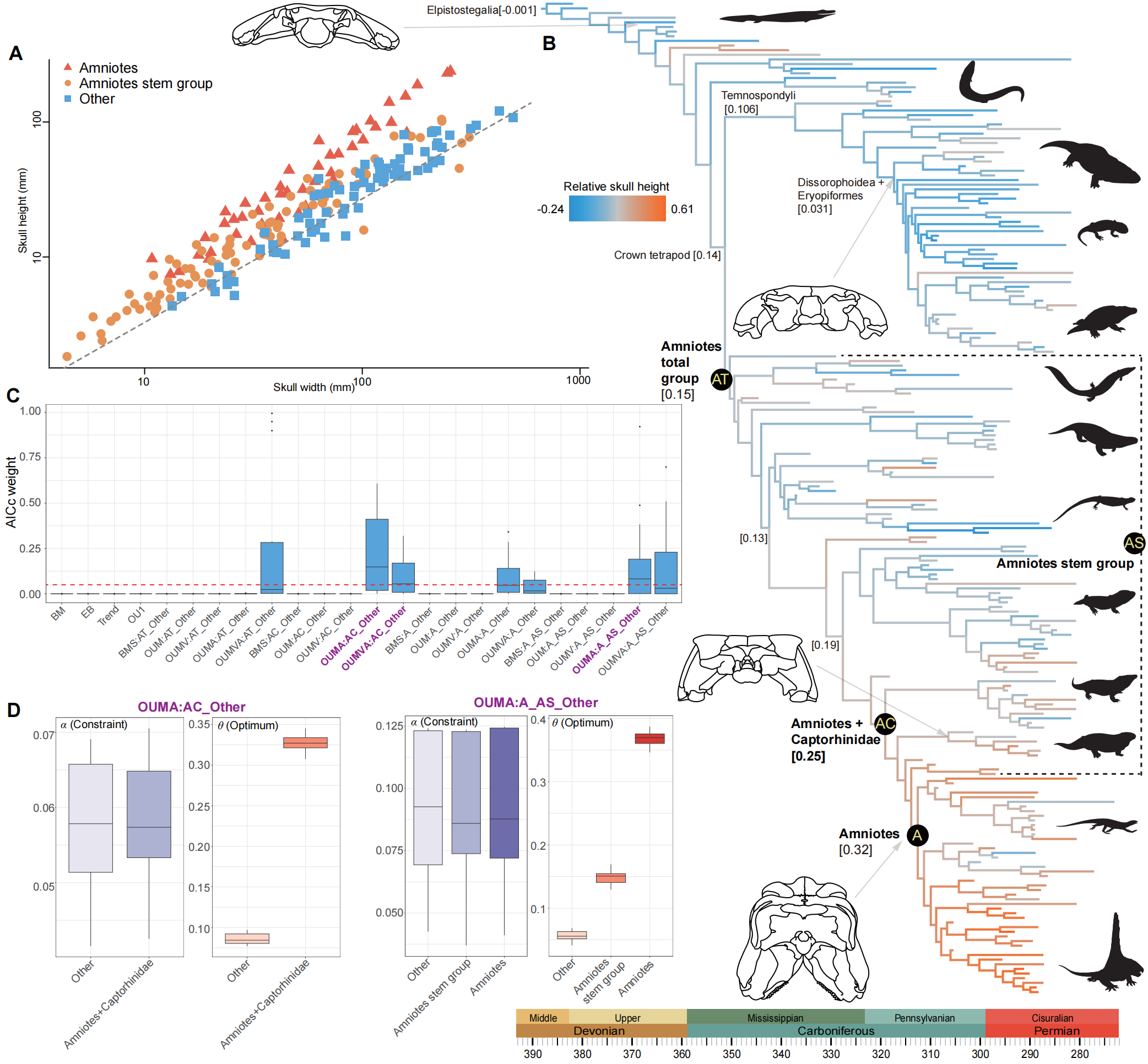 Evolution of relative skull height across early-diverging tetrapods (based on Topology 1). (Image by YU Yilun et al.)