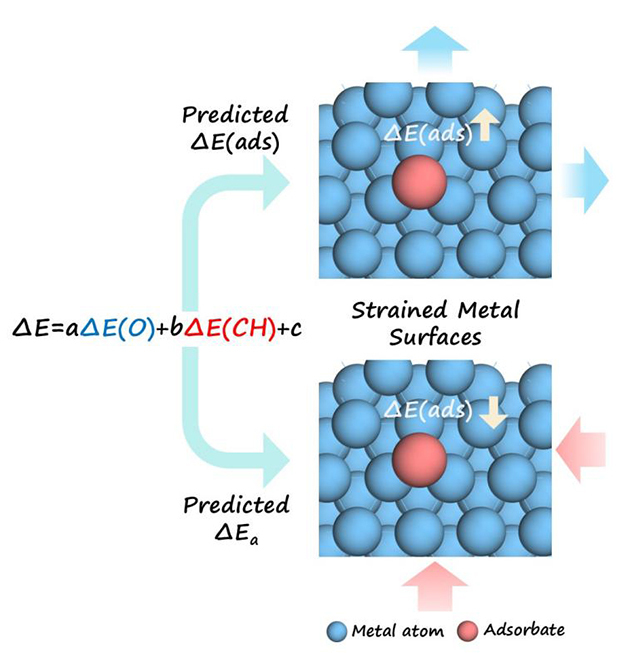 Based on this classification, the team derived the dual-descriptor linear scaling relationship ΔE(ads) = a·ΔE(O) + b·ΔE(CH) + c. The model outperforms conventional single-descriptor methods and extends successfully to reaction transition states, enabling the quantitative description of energy barrier changes under strain.