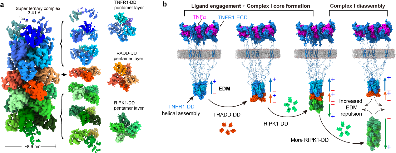 Using cryo-electron microscopy, the researchers resolved the high-resolution structure of Complex-I consisting of TNFR1, TRADD and RIPK1. The structure reveals a helical super-complex assembled by 31 copies of death domains (DDs): a layer of TRADD-DD pentamers is sandwiched between layers of TNFR1-DD and RIPK1-DD pentamers.