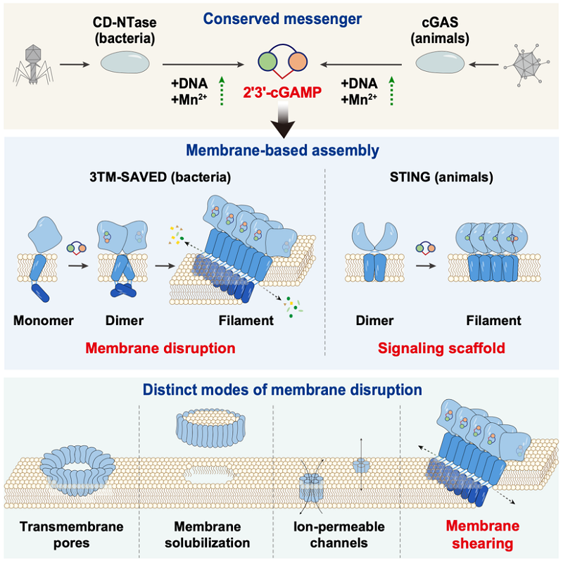 They further focused on a representative and widespread class of transmembrane effectors-3TM-SAVED. Results showed that these proteins exist as monomers in the resting state. Upon specific recognition of 2'3'-cGAMP, they first form a transient dimeric intermediate and then assemble into higher-order filaments. Structural and functional analyses demonstrated that 2'3'-cGAMP directly participates in and stabilizes the protein assembly interfaces, driving the protein stepwise from a resting state to an activated state.