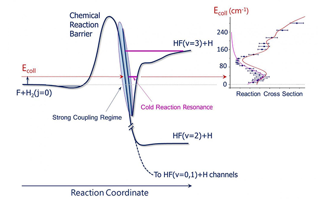The schematic shows quasi-bound quantum resonance state in the post barrier region, which is responsible for the enhanced reactivity in the F+H2 to HF+H reaction at temperature near absolute zero. (Image by YANG Tiangang)