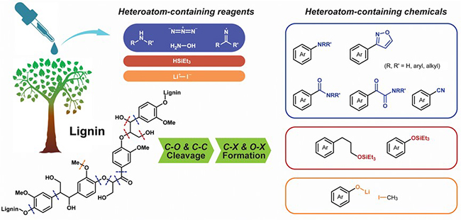 Heteroatom-containing reagents trigger the catalytic cleavage of lignin linkages and functionalization of products simultaneously (Image by LI Hongji)