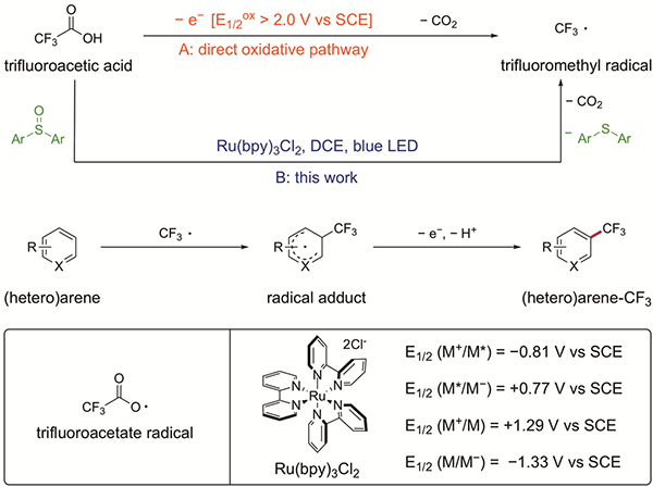 The combination of photoredox catalysis and a diaryl sulfoxide provides a platform for the facile generation of CF3 radical from trifluoroacetic acid under mild conditions. The resultant CF3 radical would then add to the (hetero) arene substrate, followed by an oxidative re-aromatization process to afford the trifluoromethylated (hetero) arene product.