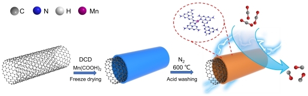 Schematic diagram of Mn SAC preparation and mechanism of electrochemical CO2 reduction (Image by FENG jiaqi)