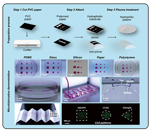 The mask could be easily prepared with flexible PVC film through a cutting crafter and applied as a pattern definer during the plasma treatment for microscale hydrophilic/hydrophobic interface formation on different substrates. The whole process required low input of time as well as toxic chemicals.